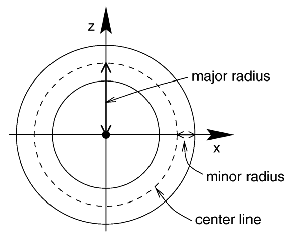 where Major is a float value giving the major radius and Minor is a float specifying the minor radius. The major radius extends from the center of the hole to the mid-line of the rim while the minor radius is the radius of the cross-section of the rim. The torus is centered at the origin and lies in the x-z-plane with the y-axis sticking through the hole.