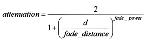 The fade_distance Fade_Distance is used to specify the distance at which the full light intensity arrives, i. e. the intensity which was given by the COLOR specification. The actual attenuation is described by the fade_power Fade_Power, which determines the falloff rate. For example linear or quadratic falloff can be used by setting fade_power to 1 or 2 respectively. The complete formula to calculate the factor by which the light is attenuated is
